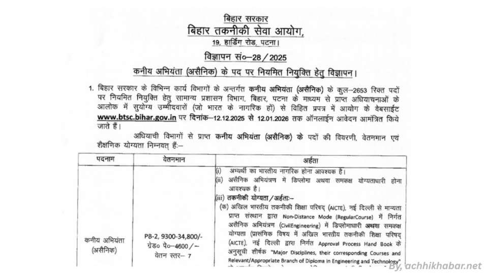 अगर आप Bihar BTSC JE Recruitment 2025 के लिए योग्य हैं, तो यह मौका बिल्कुल न गंवाएं।