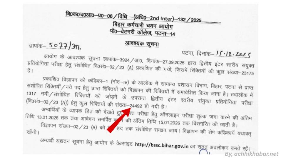 बिहार सरकार की यह भर्ती 24,492 पदों पर हो रही है, जो विभिन्न विभागों में इंटर लेवल पोस्ट्स के लिए है। Advt. No. 02/2023 (A) के तहत जारी यह नोटिफिकेशन 15 दिसंबर 2025 को पोस्ट किया गया, लेकिन अप्लाई प्रोसेस 15 अक्टूबर 2025 से शुरू हो चुका है। आखिरी तारीख अब बढ़ाकर 15 जनवरी 2026 कर दी गई है, जो कैंडिडेट्स के लिए राहत की बात है। achhikhabar.net के अनुसार, यह भर्ती इसलिए बेहतर है क्योंकि यह न सिर्फ बड़े पैमाने पर रोजगार दे रही है, बल्कि बिहार जैसे राज्य में जहां बेरोजगारी एक बड़ी समस्या है, यह स्थिर सरकारी नौकरी का रास्ता खोलती है। इसमें अच्छा वेतन, पेंशन, मेडिकल बेनिफिट्स और जॉब सिक्योरिटी जैसे फायदे हैं,