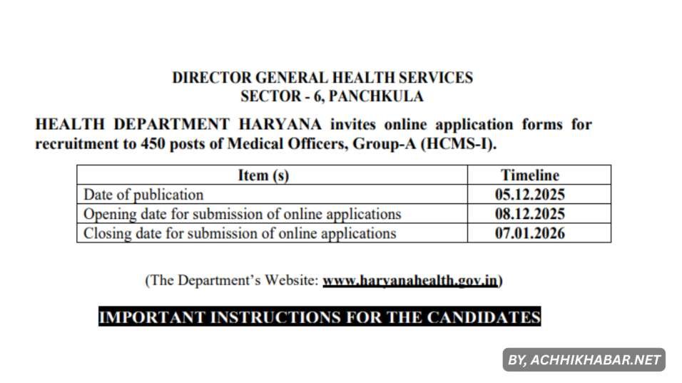 Director General Health Services, Haryana ने 450 (Haryana Medical Officer Recruitment 2025) (HCMS-I), Group-A पदों के लिए नया नोटिफिकेशन जारी कर दिया है। अगर आप MBBS Qualified हैं और सरकारी नौकरी की तलाश में हैं, तो यह मौका बिल्कुल मिस न करें। Online Application 08 December 2025 से 07 January 2026 तक भरे जाएंगे।