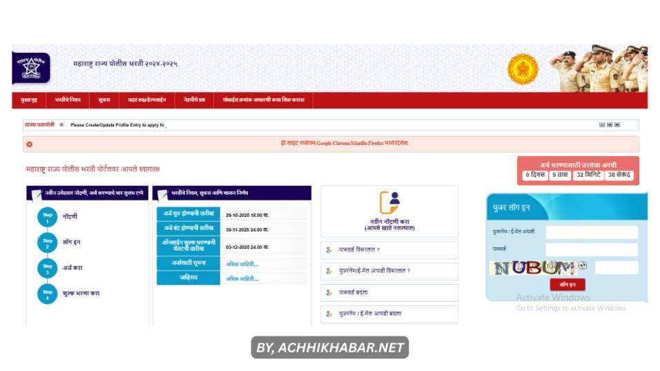 1 рдорд╣рд╛рд░рд╛рд╖реНрдЯреНрд░ рдкреБрд▓рд┐рд╕ рдХреА рдЖрдзрд┐рдХрд╛рд░рд┐рдХ рд╡реЗрдмрд╕рд╛рдЗрдЯ https://mahapolice.gov.in рдпрд╛ https://policerecruitment2025.mahait.org рдкрд░ рдЬрд╛рдПрдВ 2 рд╣реЛрдордкреЗрдЬ рдкрд░ тАЬNew RegistrationтАЭ рдпрд╛ тАЬApply OnlineтАЭ рд▓рд┐рдВрдХ рдкрд░ рдХреНрд▓рд┐рдХ рдХрд░реЗрдВ 3 рдореЛрдмрд╛рдЗрд▓ рдирдВрдмрд░ рдФрд░ рдИрдореЗрд▓ ID рд╕реЗ рд░рдЬрд┐рд╕реНрдЯреНрд░реЗрд╢рди рдХрд░реЗрдВ 4 рд░рдЬрд┐рд╕реНрдЯреНрд░реЗрд╢рди ID рдФрд░ рдкрд╛рд╕рд╡рд░реНрдб рд╕реЗ рд▓реЙрдЧрд┐рди рдХрд░реЗрдВ 5 рд╕рднреА рд╡реНрдпрдХреНрддрд┐рдЧрдд, рд╢реИрдХреНрд╖рдгрд┐рдХ рдФрд░ рд╕рдВрдкрд░реНрдХ рдЬрд╛рдирдХрд╛рд░реА рднрд░реЗрдВ 6 рдлреЛрдЯреЛ (20-50 KB) рдФрд░ рд╣рд╕реНрддрд╛рдХреНрд╖рд░ (10-20 KB) JPG рдлреЙрд░реНрдореЗрдЯ рдореЗрдВ рдЕрдкрд▓реЛрдб рдХрд░реЗрдВ 7 рдЖрд╡реЗрджрди рд╢реБрд▓реНрдХ рдХрд╛ рдСрдирд▓рд╛рдЗрди рднреБрдЧрддрд╛рди рдХрд░реЗрдВ 8 рдлрд╛рдЗрдирд▓ рд╕рдмрдорд┐рдЯ рдХрд░реЗрдВ рдФрд░ рдкреНрд░рд┐рдВрдЯрдЖрдЙрдЯ рдЬрд░реВрд░ рдирд┐рдХрд╛рд▓ рд▓реЗрдВ