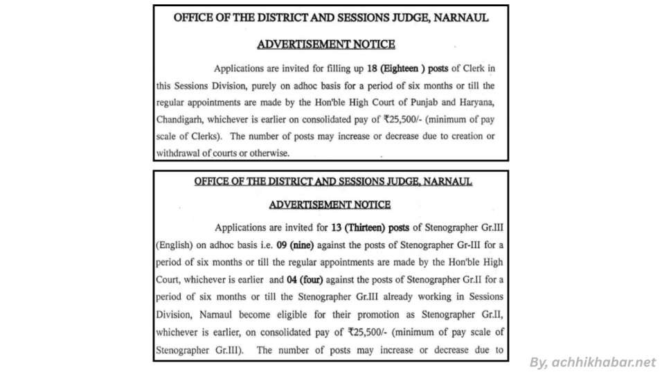 हरियाणा के युवाओं के लिए एक शानदार सरकारी नौकरी का मौका! District and Sessions Judge, Narnaul ने हाल ही में Narnaul Court Recruitment 2025 का ऑफिशियल नोटिफिकेशन जारी किया है। इस भर्ती के जरिए कुल 31 पदों पर क्लर्क और स्टेनोग्राफर की नियुक्तियां की जाएंगी। ये भर्ती अधोक आधार पर हो रही है, जो उन ग्रेजुएट उम्मीदवारों के लिए परफेक्ट है जो न्यायिक विभाग में स्थिर और सम्मानजनक जॉब चाहते हैं। achhikhabar.net पर हम आपको ऐसी लेटेस्ट और भरोसेमंद सरकारी नौकरी की जानकारी देते रहते हैं, ताकि आप कोई मौका मिस न करें।