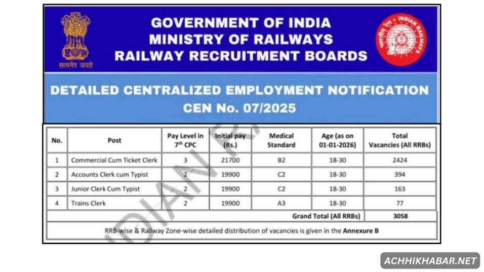 नमस्ते दोस्तों! AchhiKhabar.net की तरफ से। रेलवे ने 12वीं पास युवाओं के लिए 3058 पदों पर धमाकेदार भर्ती निकाली है – Railway Recruitment 2025। सबसे बड़ी बात? आज यानी 27 नवंबर 2025 रात 11:59 बजे तक ही फॉर्म भरा जाएगा। देर मत करना!