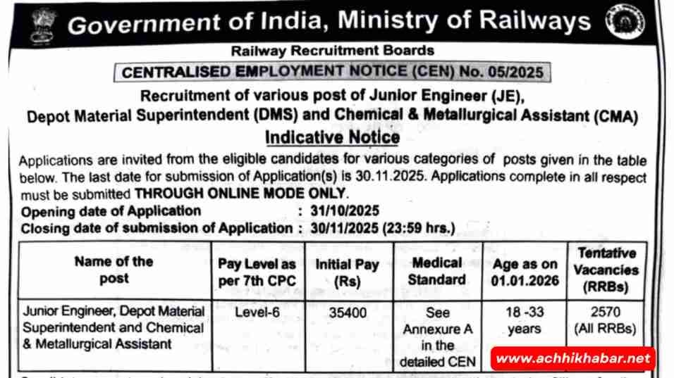 RRB JE Recruitment 2025: अगर आप रेलवे में जूनियर इंजीनियर (JE), डिपो मटेरियल सुपरिटेंडेंट (DMS), या कैमिकल एंड मेटलर्जिकल असिस्टेंट जैसे पदों पर सरकारी नौकरी की तलाश में हैं, तो आपके लिए बहुत बड़ी खबर है। RRB ने 2569 नए पदों पर भर्ती का नोटिफिकेशन जारी किया है, जिसकी जानकारी डायरेक्ट www.achhikhabar.net पर भी मिल जाएगी।