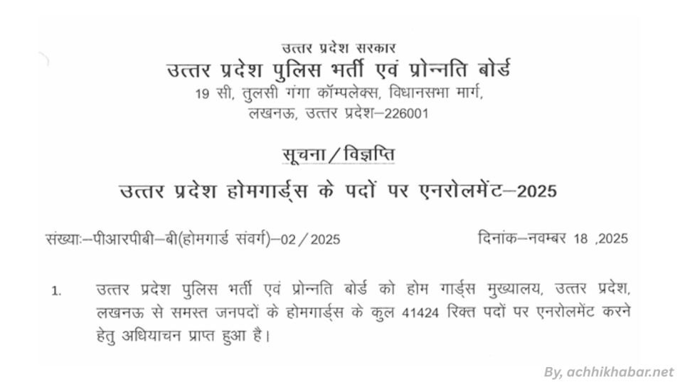 उत्तर प्रदेश के युवाओं के लिए एक रोमांचक खबर! अगर आप पुलिस विभाग में शामिल होकर देश सेवा का सपना देखते हैं, तो UP Police Home Guard Bharti 2025 आपके लिए एक बड़ा मौका लेकर आया है। उत्तर प्रदेश पुलिस भर्ती एवं प्रोन्नति बोर्ड (UPPRPB) ने हाल ही में 41,424 पदों पर भर्ती का आधिकारिक नोटिफिकेशन जारी किया है। यह भर्ती न सिर्फ नौकरियां देगी, बल्कि आपके जीवन को स्थिरता और सम्मान भी प्रदान करेगी। achhikhabar.net पर हम आपको इस भर्ती की हर छोटी-बड़ी डिटेल बताएंगे, ताकि आप आसानी से आवेदन कर सकें और सफल हों।
