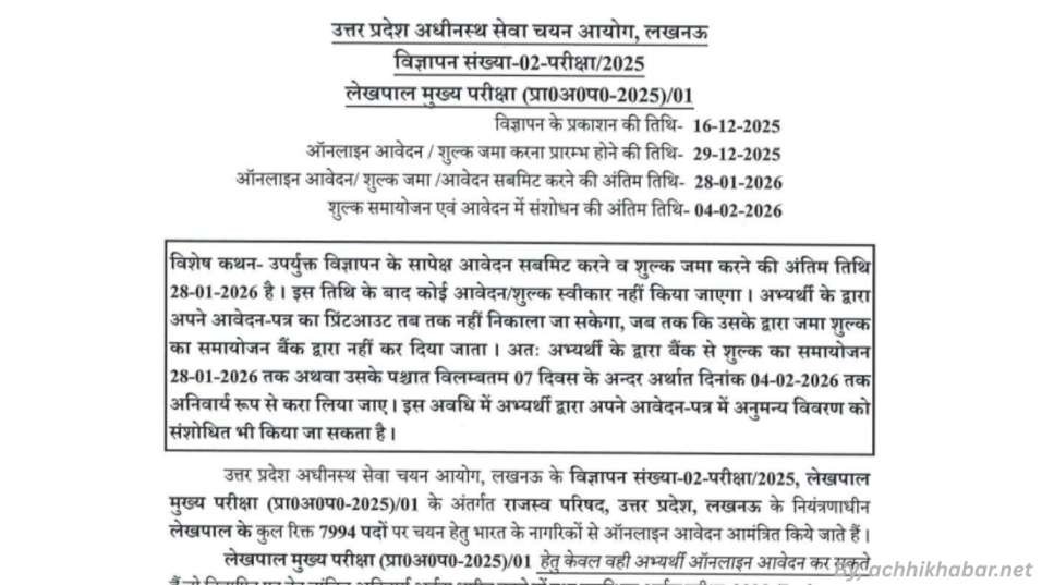 उत्तर प्रदेश में सरकारी नौकरी की तलाश कर रहे युवाओं के लिए बड़ी खुशखबरी! उत्तर प्रदेश अधीनस्थ सेवा चयन आयोग (UPSSSC Lekhpal Recruitment 2025) का आधिकारिक नोटिफिकेशन जारी कर दिया है। इस भर्ती के तहत कुल 7994 पदों पर नियुक्तियां की जाएंगी। अगर आप 12वीं पास हैं और UPSSSC PET 2025 में क्वालीफाई कर चुके हैं, तो यह आपके लिए सुनहरा अवसर है। achhikhabar.net पर हम आपको इस भर्ती की हर छोटी-बड़ी डिटेल दे रहे हैं, ताकि आप बिना किसी कन्फ्यूजन के आवेदन कर सकें।